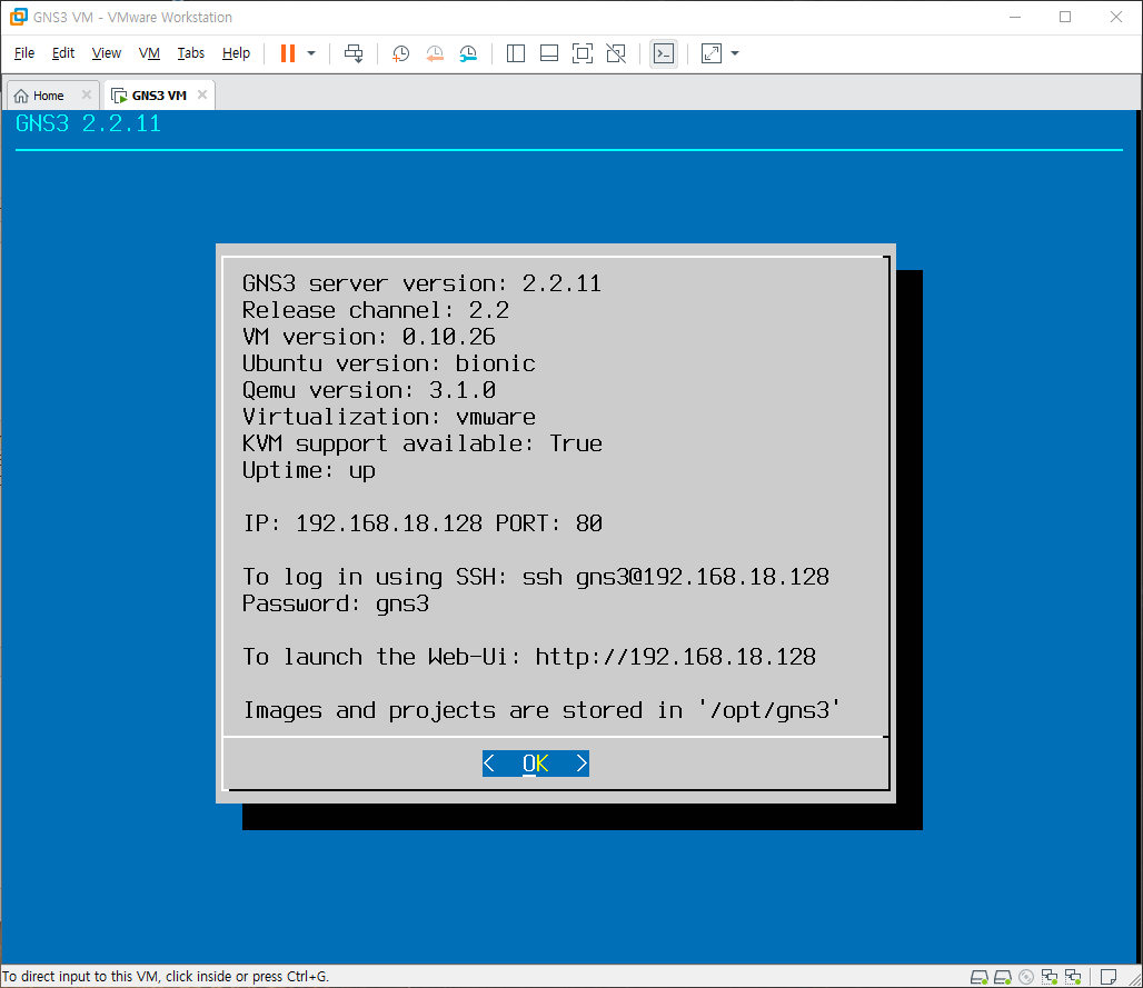 잘 부팅이 되었다면 위와 같은 화면으로 GNS VM이 우리를 반겨줄 것입니다.