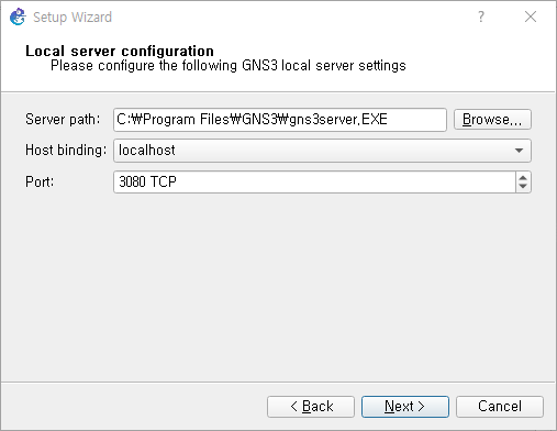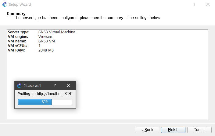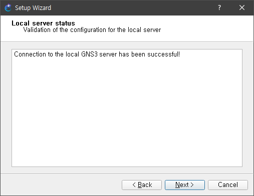 Next를 누르시면 GNS3 local Server와 접속이 완료되었다는 창이 뜨고 Next를 누르시면
