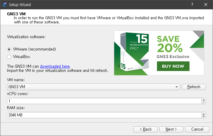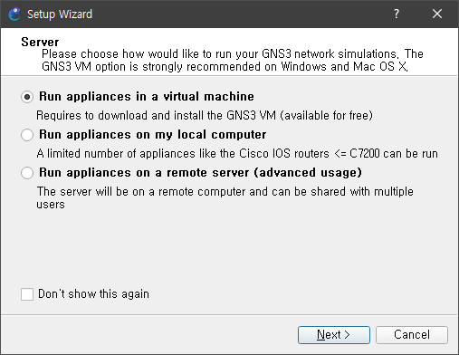 첫 번째 체크박스는 아까 올린 GNS3 VM에서 거의 모든 장비들이 실행되게 됩니다.