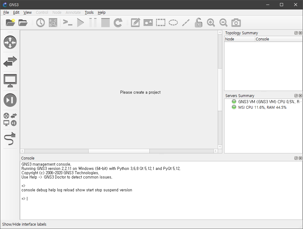 설치 후 잠시 내려두었던 GNS3창을 다시 띄어주시면 아래와 같은 창이 있을건데