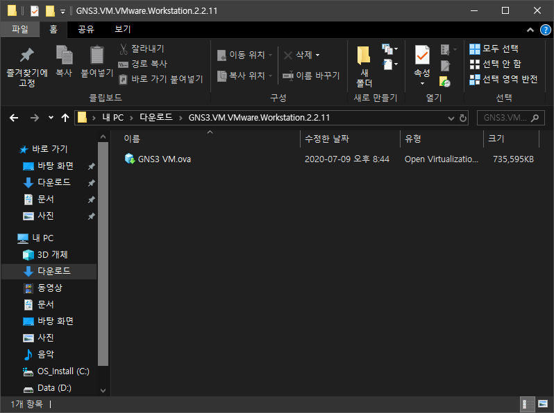 압축을 풀어주게 되면‘GNS3 VM.ova’파일이 나오게 됩니다.