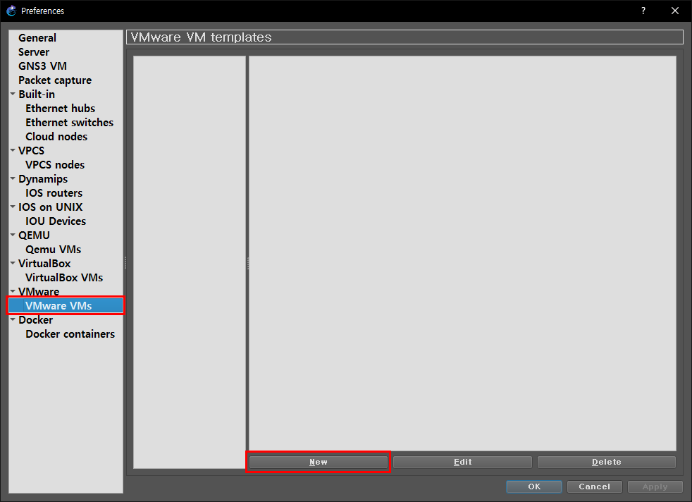 설치가 완료됬다면 가상머신을 GNS3에 추가시켜 봅시다.
