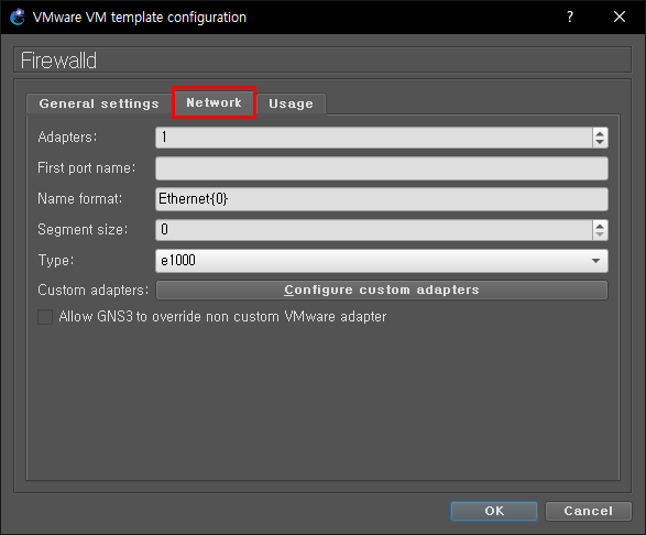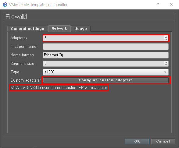 Adapters를 3개로 늘린 후 아래의 Allow GNS3를 체크 하고 Configure custom adapters를 누릅니다.
