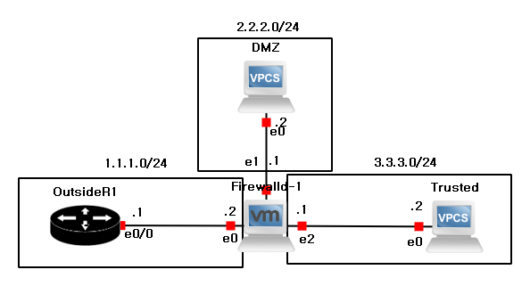 하지만 외부의 OutsideR1에서는 내부의 DMZ나 Trusted로 접근이 불가 합니다.