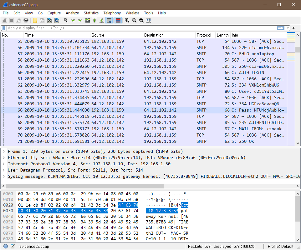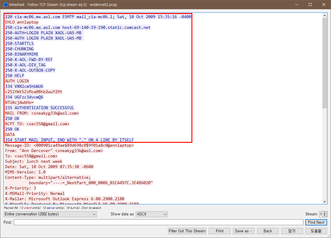 위와 같이 추정이 가능하고 크게 TCP Stream이 2개있었습니다. 이 Stream은 SMTP가 어떤 정보를 주고 받았는지를 담고 있었고 이를 바탕으로 분석을 진행하였습니다.