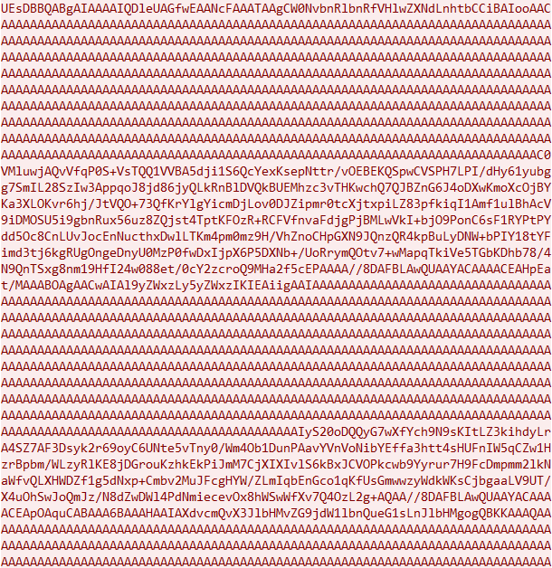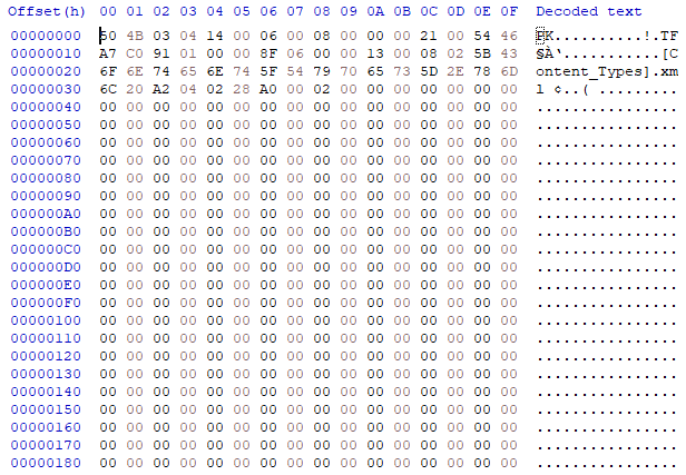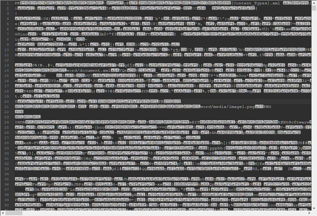 이 사진은 우 클릭으로 생성한 빈 docx파일 입니다 문자 Encoding 문제로 조금 다르지만 앞의 Content_Types라는 문구가 똑같은 것을 보니 신뢰가 조금 가기 시작합니다. 그럼 복구한 파일을 메일의 첨부파일과 똑 같은 이름과 확장자로 변형 후 열어 보겠습니다.