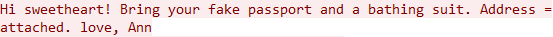 해석해보면 연인이라고 하는 인물에게 인사하고 가짜 여권과 수영복을 가져오라고 합니다. 그리고 주소는 첨부되어 있다고 되어있습니다. 이를 통해서 해당 E-Mail은 숨겨진 연인에게 보낸 E-Mail임을 추측할 수 있습니다. 확실하지는 않지만 정황상의 근거로 답을 채울 수 있습니다. 또한 가져오라고 한 두가지 물건도 알 수 있습니다.