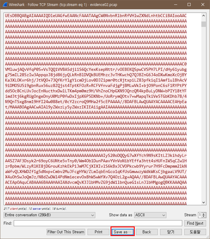 그럼 이 문자열을 가지고 와서 Decoding을 진행한 뒤 복구를 진행하여야 하기 때문에 해당 TCP Stream의 Save as.. 버튼을 클릭하여 저장하도록 하겠습니다.