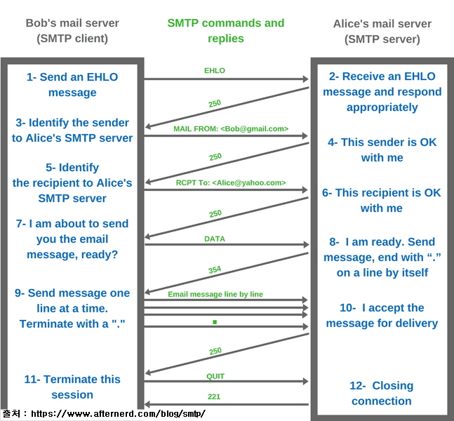 설명에 앞서 위 그림에서는 Bob과 Alice가 메일을 주고받는 상황입니다. 위 과정을 정리해 아래에 풀어 보았습니다. 각 코드에 대한 설명은 조금 더 아래에서 할 예정이니 어떤 행위를 하는지 정리하겠습니다. 정리과정에 앞서 Bob의 SMTP Server를 B Server, Alice는 A Server라고 편의상 줄여 말하겠습니다.