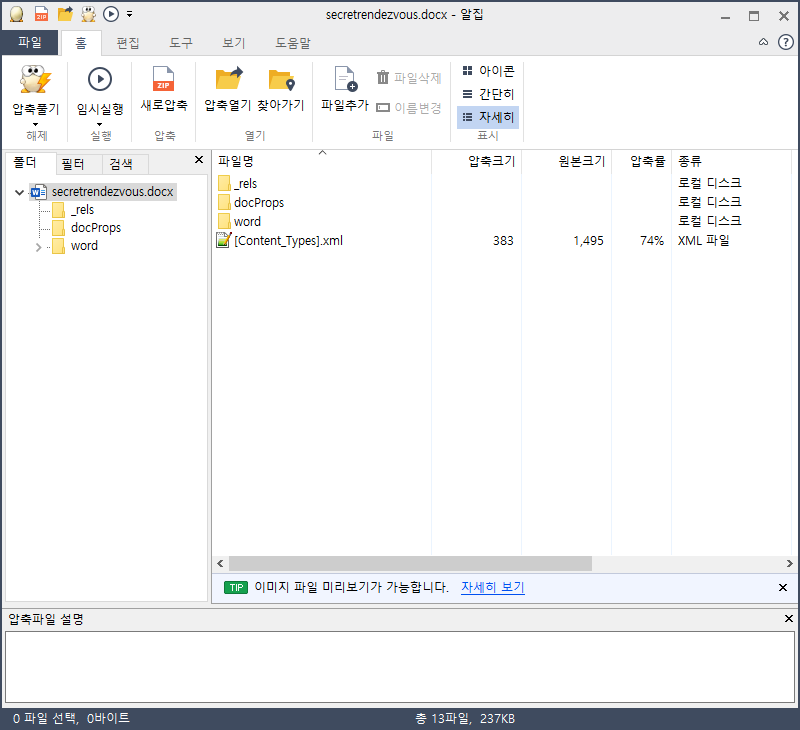 이렇게 마지막 한 문제인 8번만을 남겨 두고 있습니다. 문서에 포함된 이미지의 MD5를 구하면 되는데 이 부분은 쉬워 보이지만 지식이 조금 필요합니다. 풀기에 앞서 docx 파일의 구조를 먼저 알아야 합니다. docx 파일은 기본적으로 많은 xml 파일이 모여 압축된 파일이라고 볼 수 있습니다. 그래서 HxD로 둘러보면 .xml 확장자가 많습니다. 이렇게 압축된 형태이다 보니 zip 파일과 Signature또한 같습니다. 정확하지는 않지만 이러한 Signature를 가진 바이너리 파일은 알집, 반디집 등으로 열어볼 수 있습니다. 아래는 복구한 파일을 알집으로 열어본 결과 입니다.