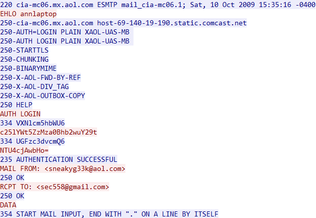 4 ~ 5 : 해당 SMTP Server에는 인증을 사용하고 있고 메커니즘으로는 XAOL-UAS-MB를 사용하고 있음. 해당 메커니즘은 AOL Mail이라는 웹 기반 메일 서비스에서 사용하고있는 메커니즘으로 자세한 내용은 얻기 힘듬