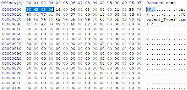 이렇게 Decoding된 파일을 저장 후 확인해 보도록 합시다. 일단 .docx 파일의 Signature는 ‘50 4B 03 04’ 이고 HxD로 확인해본 결과 바로 Signature가 바로 앞에 존재하는 것을 알 수 있습니다. 하지만 해당 Signature 값은 다른 PK파일들도 많이 사용하는 Signature값이라 확실한지는 알 수 없습니다. 그래서 다른 docx 파일과 구조를 비교해 보았습니다.