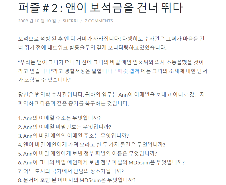 Ann이란 인물이 보석으로 석방 뒤 사라지게 됩니다. 그리고 Ann의 애인 X씨와 소통을 했을 것이라고 경찰서장은 추측하였고 Ann이 네트워크 통신으로 어떤 행위를 했는지를 캡쳐 한 pcap을 이용하여 Ann이 어디로 갔는지 파악하고 증거를 수집하는 과정입니다.